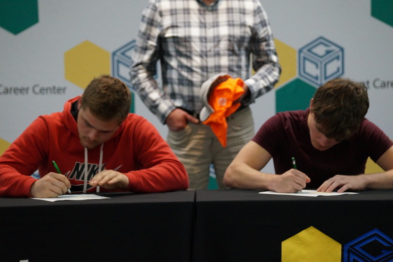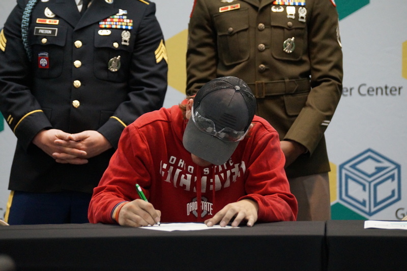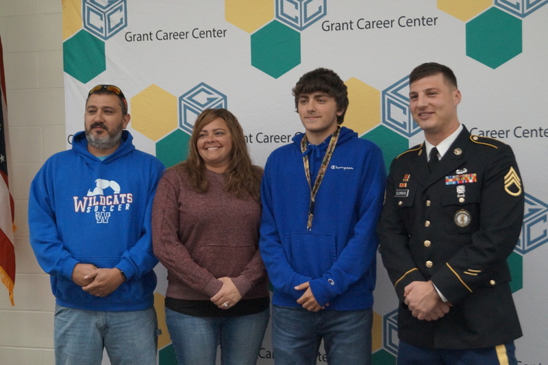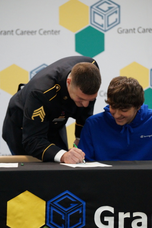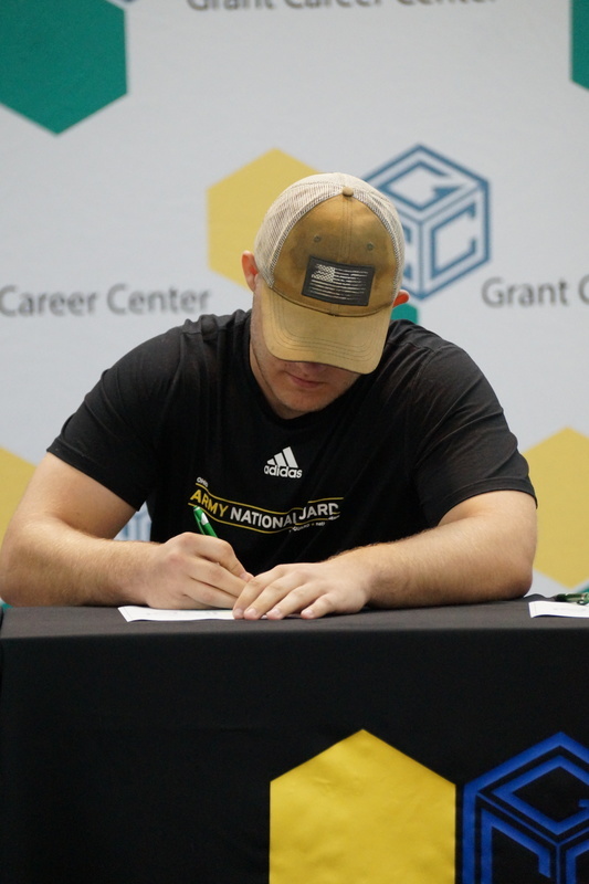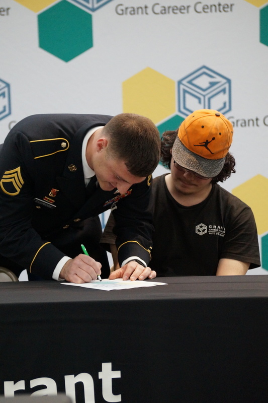 Grant Career Center held their annual Signing Day on Thursday, April 28, 2022. Students who plan to attending college, joining the military, or being offered full-time work following graduation were asked to participate. The program was hosted by Chad Graybill, Work Based Learning Coordinator, and Jaimie Smith, Instructional Coach. We had 12 businesses on campus that recognized 16 students who are currently employed and plan to continue their careers with full-time employment. Seven students from Grant Career Center have pledged and committed to join the United States Armed Forces.
